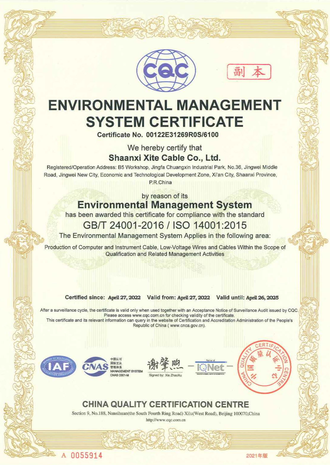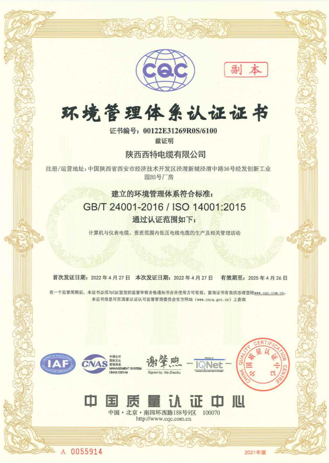 環境管理體系認證證書