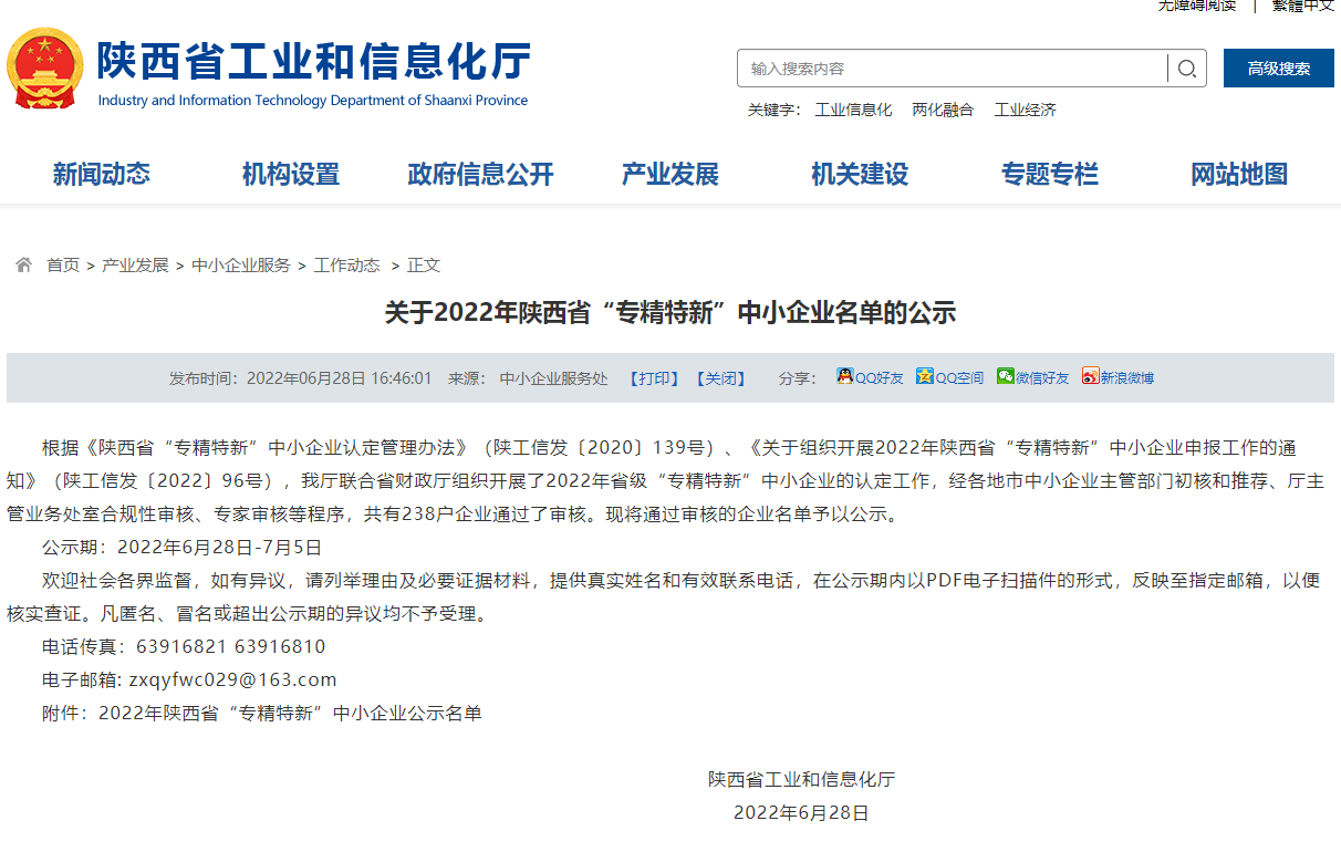 2022年度陜西省“專(zhuān)精特新”中小企業(yè)公示名單